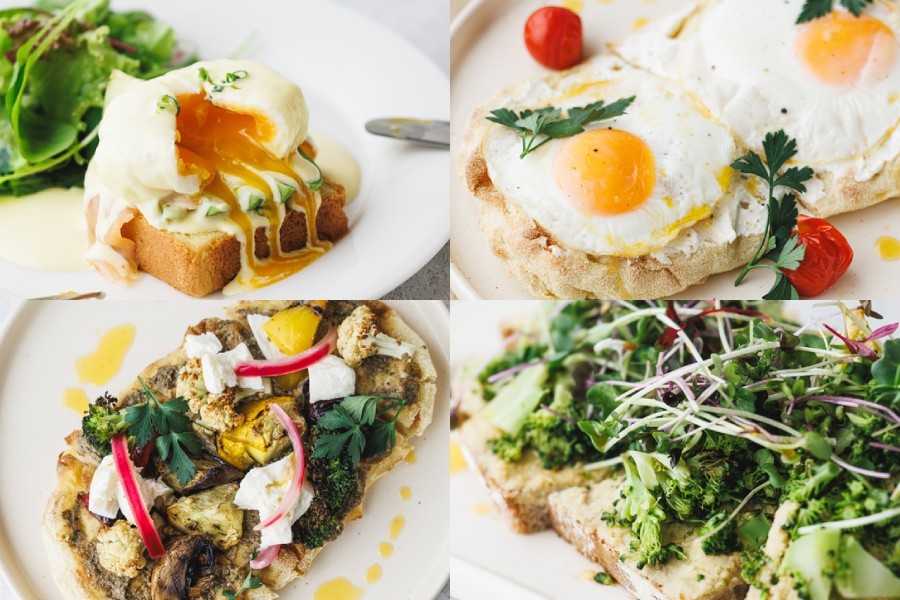 トーストしたブリオッシュにフレッシュアボカド、スモークサーモン又はハム、半熟のポーチドエッグの「エッグベネディクト」。上にはレモン風味のオランデーズソースがオン。ナイフを入れて黄身が流れ出る様は映え間違いなし!
