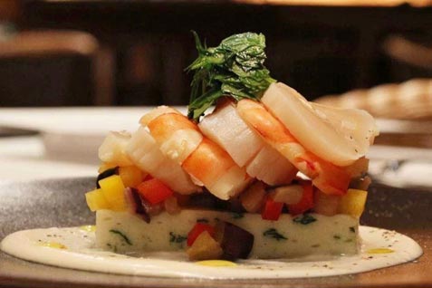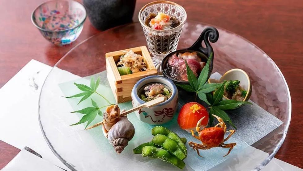 提供する料理は、和レトロの雰囲気にぴったりの、和と洋のエッセンスを美しく散りばめた創作日本料理。季節ごとに変わるコースでは、日本各地から集めた旬の食材をたっぷりと使用する。