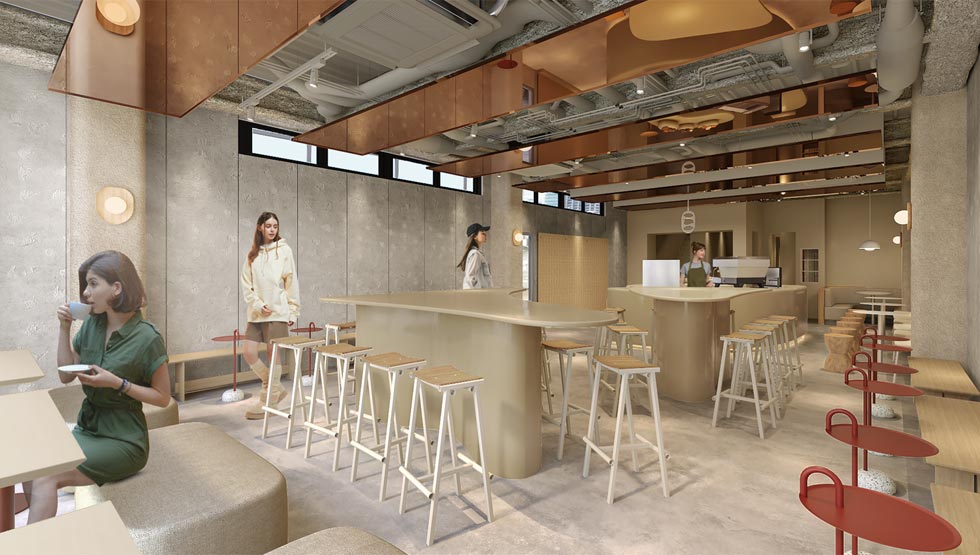 無機質でスタイリッシュなインテリアに、木の温もりが加わることで、若者から年配の方まで、幅広い世代の人たちが、自然と足を運びたくなる「親しみやすさ」を表現しています。