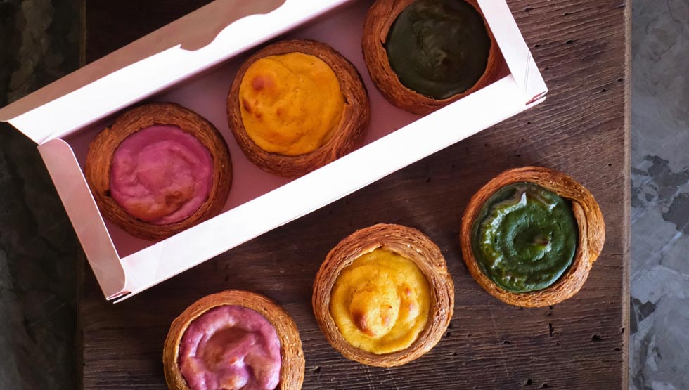 代表的な商品は「フラン・パティシエ」。特殊技法を用いた多層の筒状のパイ生地にフラン液を流し込んで焼き上げるひと品で、外はパリサク、中はプルトロと、食感のコントラストが特徴です。