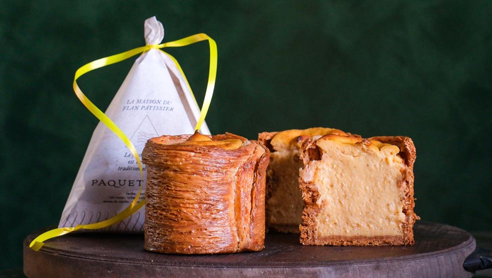 特殊技法を用いた多層のパイ筒と、塩をきかせた底のブリゼ生地を別焼きして組み立て、フラン液を流し込んでから、さらに焼き上げるオリジナルスタイルの代表商品です。